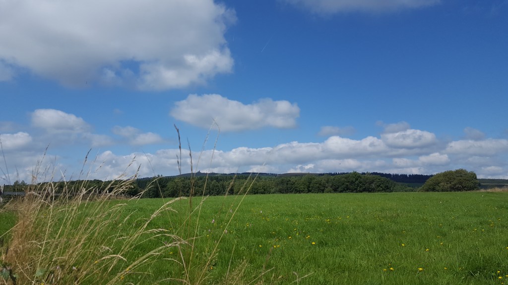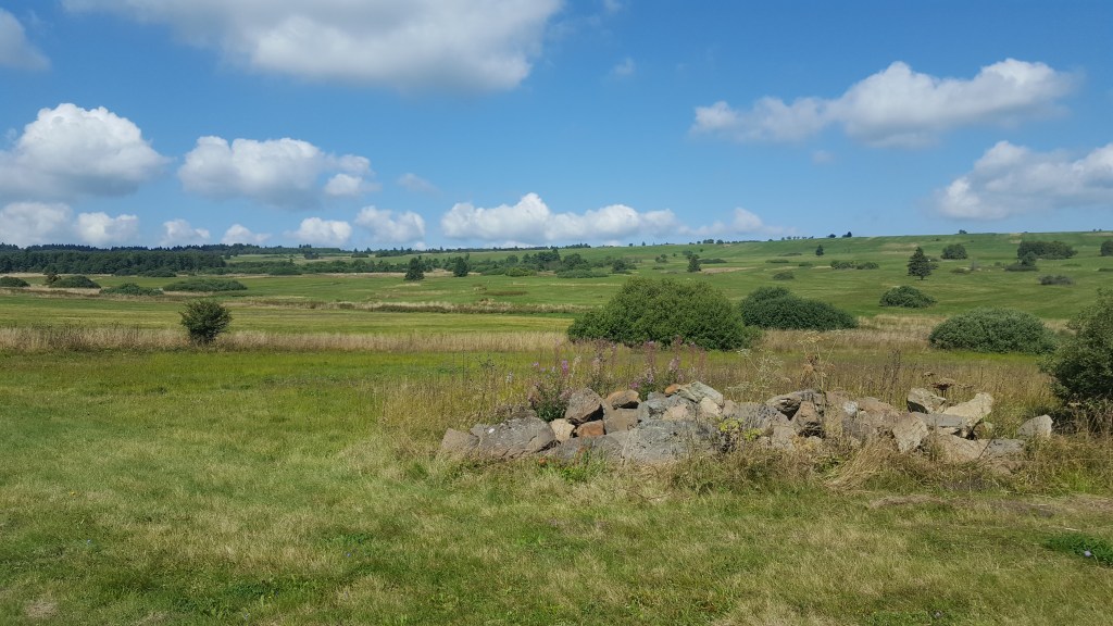 wir stapfen auf schmalen pfaden durch schöne wiesen und wälder, geniessen den blick auf die wasserkuppe. schauen den segelfliegern nach, die einer nach dem anderen von motorfliegern hochgezogen werden. überall plätschern kleine bäche und quellen. in der kernzone des roten moors geht es über bohlen durch wunderbare birkenwälder mit farnen, schachtelhalm und heidelbeersträuchern. das moor wurde bis anfang der 80er-jahre abgebaut und zerstört, jetzt wird mühsam versucht, wieder genug feuchtzonen zu schaffen. wir kommen an dem ehemaligen dorf mohr vorbei, das nach einem moorbrand auf der entstandenen fläche aufgebaut, im 30-jährigen krieg aber wieder zerstört wurde. ein schmaler pfad führt uns über eine hochweide voller felsbrocken. wundersame gegend. wir sitzen lange auf einem bänkle, schauen den kühen und vögeln zu. dann der letzte aufstieg – und hinunter zu den rädern.
