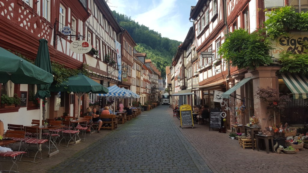 miltenberg zieht sich der länge nach am main entlang. eine fast endlos lange alte gepflasterte „hauptstrasse“, eher gasse, gesäumt von fachwerkhäusern und kleinen läden mit viel flair. ein tanklaster zwängt sich durch die gasse, wahrscheinlich kommt der von der ortsbrauerei 100 meter weiter.