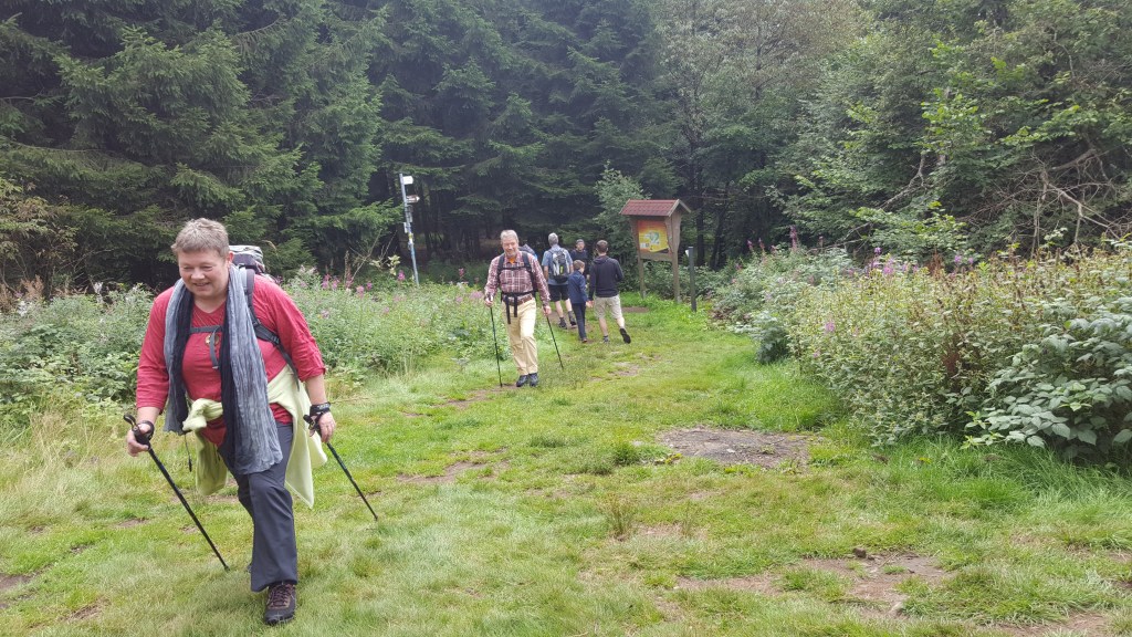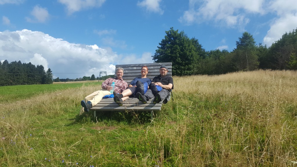heute wandertag zusammen mit tine und klaus. der beginnt aber mit einem anradeln von 10 km nach busenborn – davon 8 km kräftig bergauf auf dem „hstg“ hoherodskopfsteig, mindestens 250 höhenmeter. wir schnaufen, schieben, schwitzen. aber wir schaffen’s.