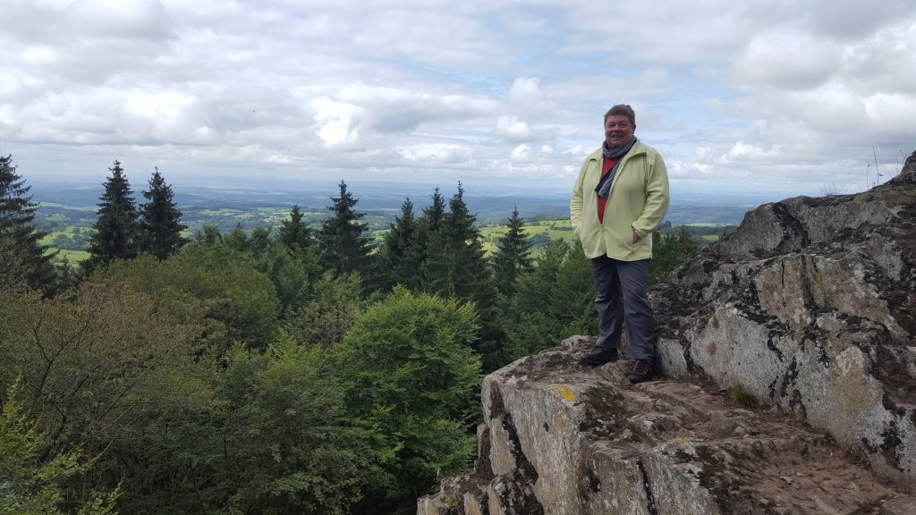 dann fröhlich losgewandert auf der gipfeltour. sie führt uns von busenberg zum bilstein hinauf (665m). dann auf den hoherodskopf, dem höchsten berg des vogelbergs (764). dann zum gackerstein (663). die anstiege sind knackig und schweisstreibend, die aussichten sind super. wir sehen bis zur skyline von frankfurt, etwa 50km weit. weite wiesen, schafe und lamas auf der weide. darüber schweben falken. am wegrand wildschweinspuren. buchenwaldstücke mit weitverzweigten alten bäumen. mooswäldchen. feuchtwiesen. erikakraut und heidelbeerbüsche. immer wieder wechseln wir zu anderen biotopen und staunen – geniessen. am himmel wolkenzüge. der bilstein ein spannender felsenhaufen. der gackerstein mit grossem kreuz und ruhigen wiesen. am hoherodskopf natürlich publikumsverkehr, aber abseits davon ist nicht viel los. selten eine so abwechslungsreiche wanderung erlebt. am ende schmerzen die beine schon ein wenig.