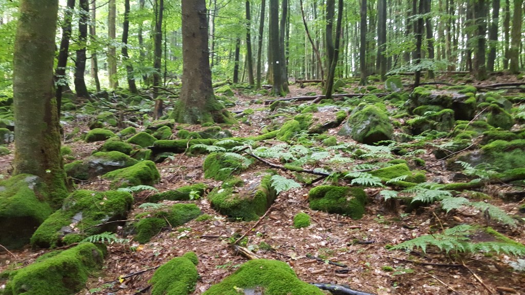 regentag. wir ziehen um ins „mein kleinHotel“, stellen unsere räder samt gepäck ab, sehr nette besitzerin. dann wandern wir trotz regen los. wir nehmen uns einen teil der felsentour vor. es ist sehr schön und seehr nass. wir sind irgendwann von innen und aussen durchweicht, die füsse schwimmen in einem wasserbett. auf gut schwäbisch: „soichnass“. verwunschene waldstücke voller basaltbrocken, hexenstein und die felswand diebstein, weite wiesen dazwischen, bäche und zwei kleine seen. in lanzenhain mit der schindel-dorfkirche vespern wir im bushäusle, da hört es zwischendurch mal auf zu regnen. ausser uns sind sieben rehe, ein fuchs, eine menge kühe, eine ziegenherde, ein paar rhönschafe und einige krähen unterwegs. menschen sehen wir zweimal von weitem. am ende tun uns die nassen füsse weh. wir kehren wie gestern in der eisdiele in herbstein ein und probieren weitere sorten – der kälte und nässe zum trotz!