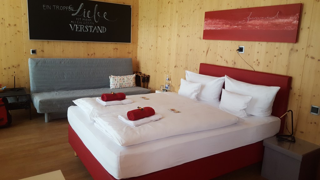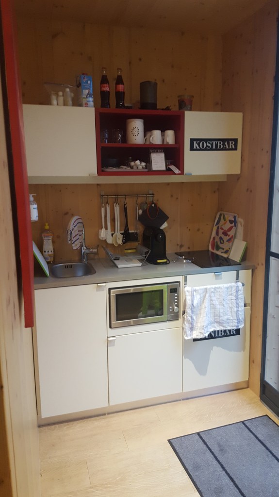 dann das kleinHOTEL: wir haben ein apartment im container im garten – es ist gigantisch. der container perfekt eingerichtet, mit bett, couch, tisch, miniküche, bad – alles stimmt bis ins kleinste detail, den kleinsten haken. in der küche eine „kostbar“ voller weckgläser mit leckeren gerichten vom hirschgulasch bis zur veganen kürbissuppe und schokokuchen (sindbadfood aus heidelberg, alles bio). die besitzerin stellt uns als erstes einen wäscheständer für unsere nassen klamotten hin. wir sind begeistert. so lässt es sich leben. wir duschen, sortieren uns, kochen makmur-sosse mit kebabbällchen, dazu kartoffelbrei und eine flasche pfälzer chardonnay.